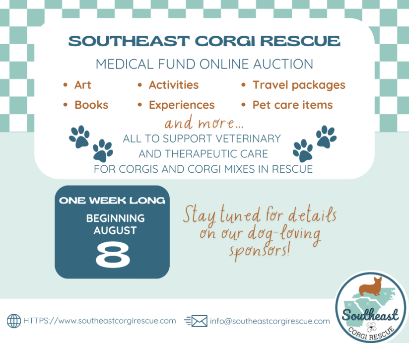 SECR is excited to announce our first ever online auction to raise funds to cover veterinary and therapeutic care for corgis (and corgi mixes) in our rescue. So please, mark August 8th-15th on your calendar and take this opportunity to HELP US HELP THEM!