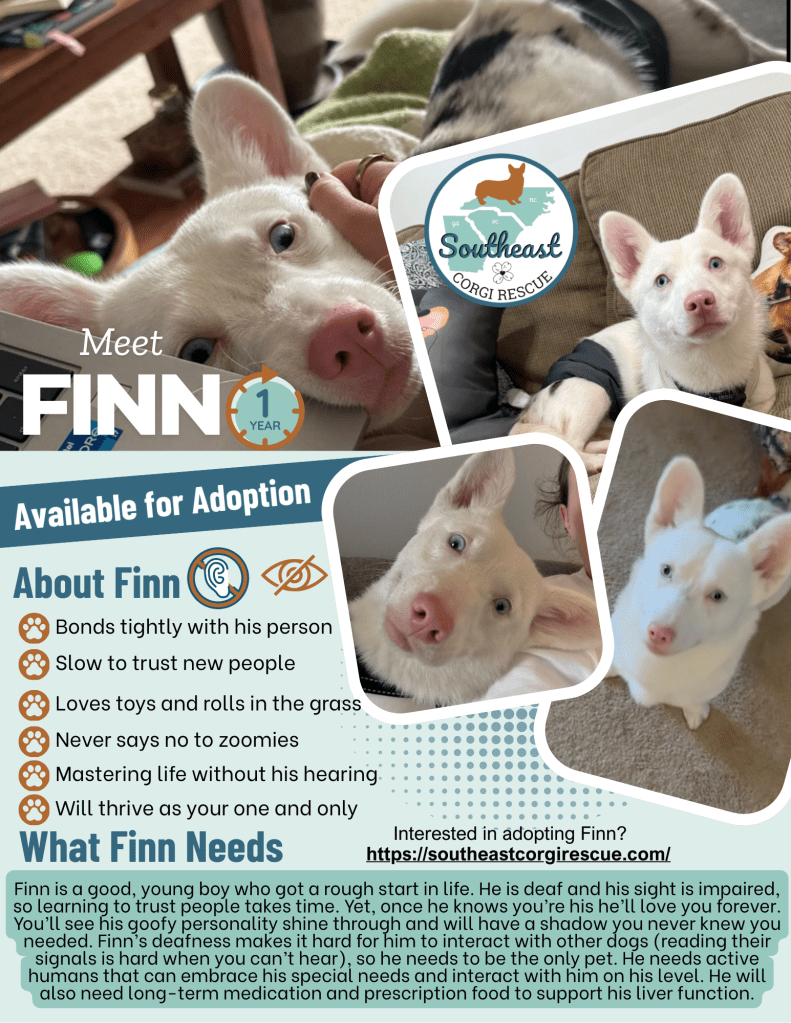This little guy has been through a lot in his short life and it hasn’t all been easy, but he’s learned to conquer his challenges with a little time, love, and patience from people he can trust. Read more about Finn here and in his individual Facebook album. If you’re ready for a four-legged shadow and think you can check all of Finn’s boxes, head to our website to submit an application.