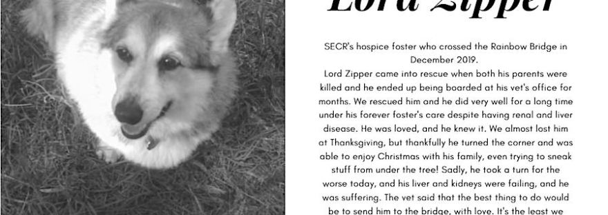 It breaks our hearts to have to share the news with you that our sweet senior boy Roscoe left us yesterday to cross the rainbow bridge. Roscoe joined the SECR family as a hospice foster several months ago after his 95-year-old owner passed away. One of our long-time fosters found room in her heart to… Continue reading Rest In Peace, Roscoe