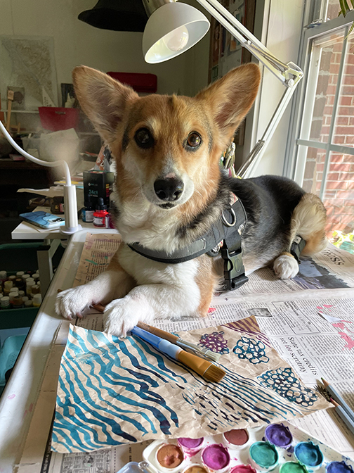 Introducing Rory the Painter! After she’s taken you on a magical road trip, cured all your health concerns thanks to her Canine PhD in Corgi Care, and baked you a tasty treat in Rory Crocker’s kitchen, this girl will paint you a picture. Of what, you ask? Of the beautiful, happy life you will have with this sweet girl by your side as your loyal foster.