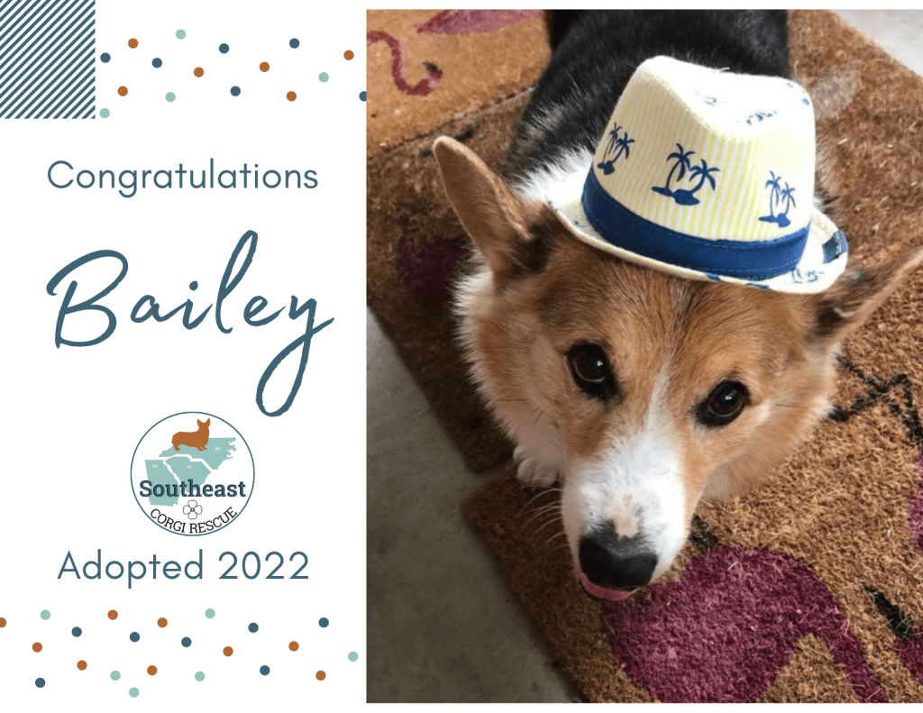 This boy joined the SECR family almost a year ago after his original owner passed away and he was having difficulty adjusting to life with several younger dogs – and a house full of stairs – with his extended family. His foster family took Bailey in ready to help him address his arthritis and get on a healthy diet and exercise plan. He became a trimmer, healthier, and happier corgi and found his new forever in the process. Bailey has officially been adopted by his fosters and we look forward to hearing about all the fun that life brings in his golden years.