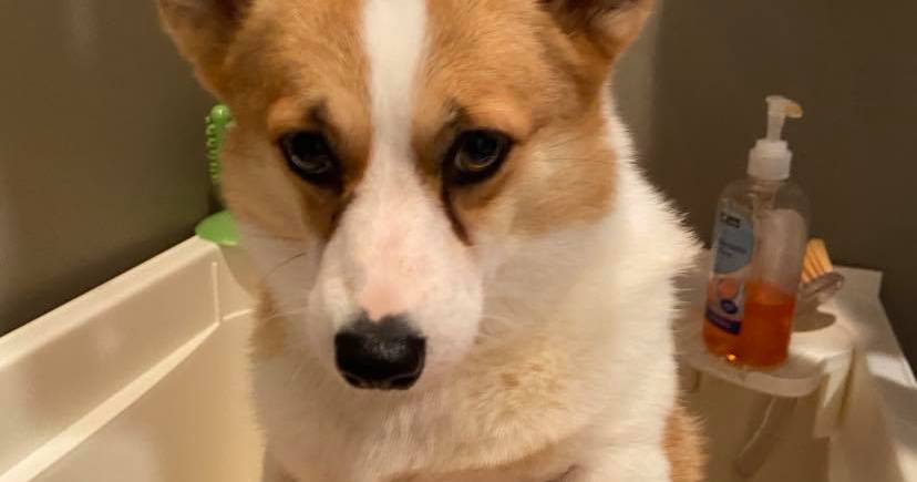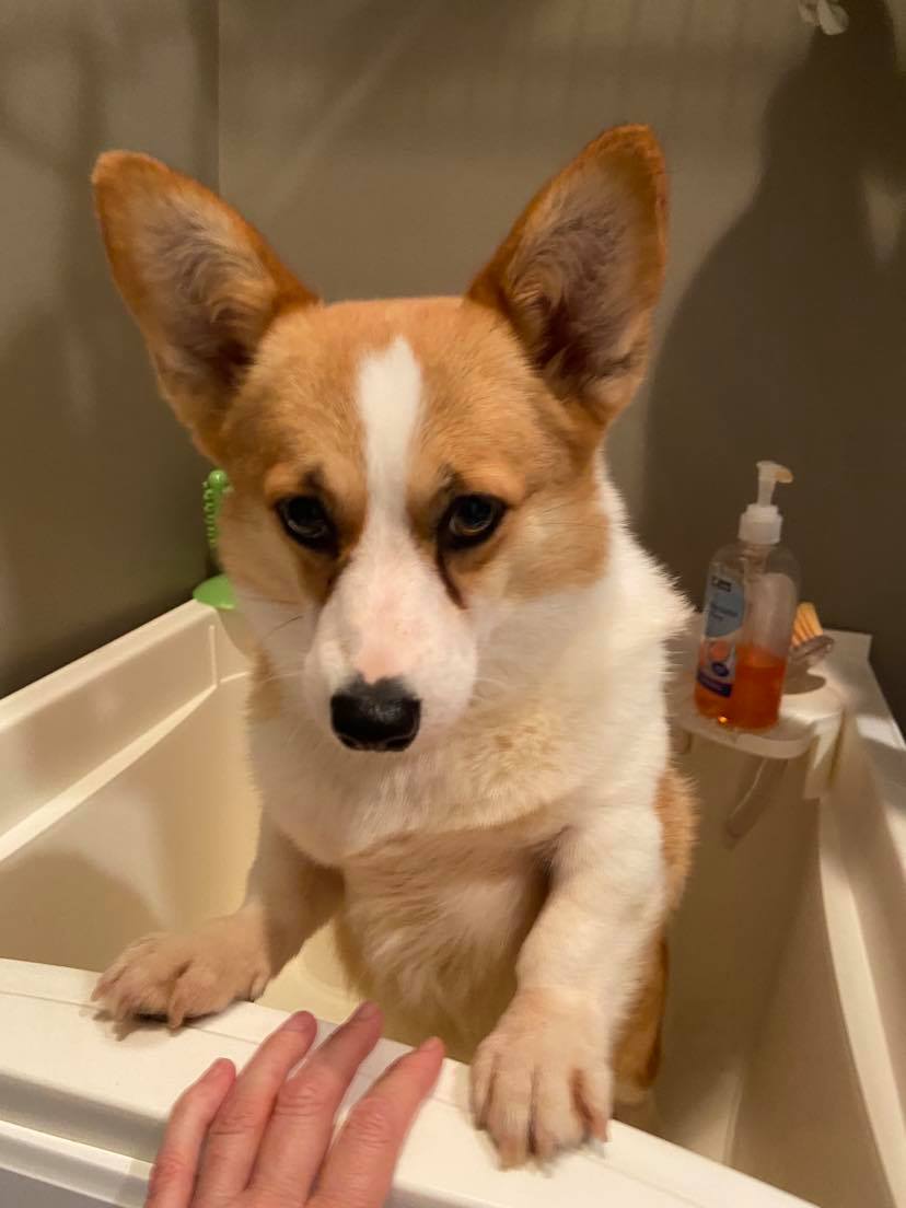 Short for Peridot, Peri is the youngest of this group of mill rescues at 2 years old. She has her first vet appointment as an SECR newbie later this week, and we are keeping our paws crossed that she gets a good health report. In the meantime, she’s settling in well as a foster. Peri had a bath today and really wasn’t sure it was necessary, but she sure looks cute in her little tub!