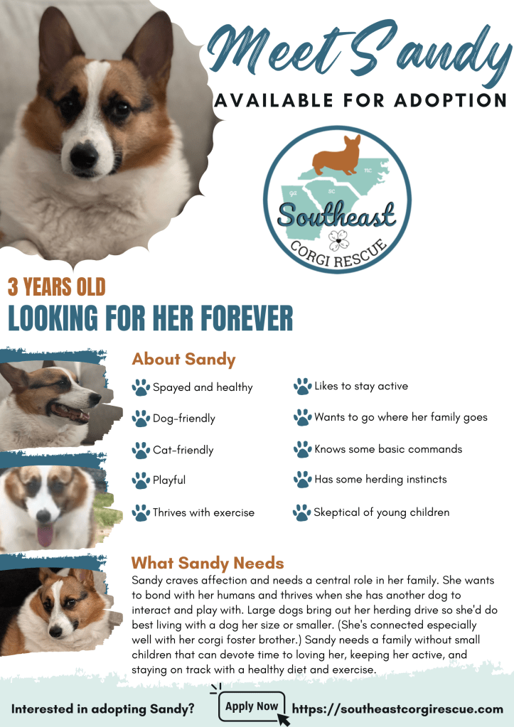Sandy is a young, active, and energetic girl. She craves affection and needs a central role in her family. She wants to bond with her humans and thrives when she has another dog to interact and play with. Large dogs bring out her herding drive so she’d do best living with a dog her size or smaller. (She’s connected especially well with her corgi foster brother.) Sandy needs a family without small children that can devote time to loving her, keeping her active, and staying on track with a healthy diet and exercise.