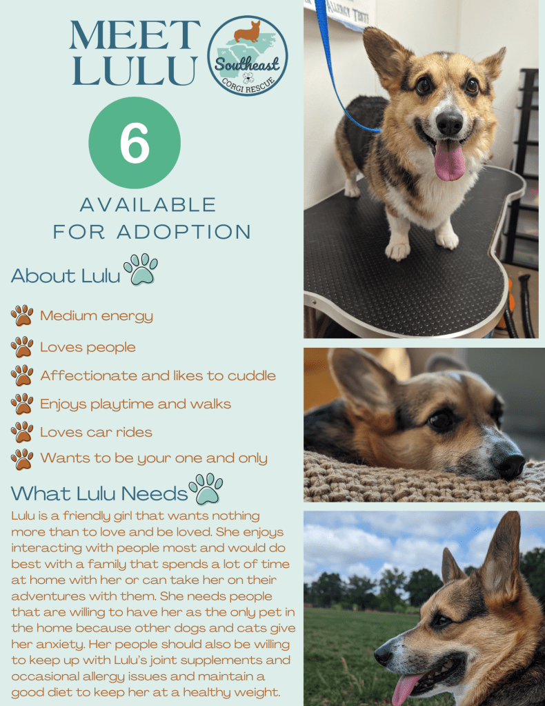 Welcome to the SECR family, Lulu! We’re glad to have you with us and look forward to getting you on the road to the good corgi life.