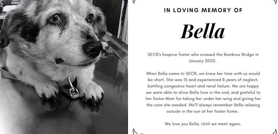 Update 1/22: Bella went to the emergency vet suffering from renal failure in addition to congestive heart failure. The vet felt that there was nothing that could be done to save her. Her foster mom went to be with her, and we sent her peacefully to the bridge. We are sorry that we were unable to help her but her issues were just too severe. She was neglected for over eight years. But she knew love in the end. We are so grateful to her foster mom, who knew that her time would be short. This is how we like to remember Bella, resting in the sun at her foster home. We love you Bella. Until we meet again.