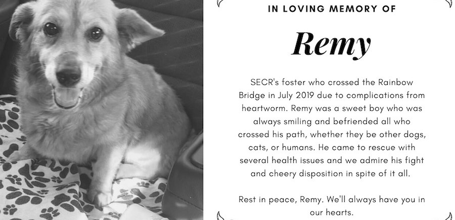 His foster is beyond heartbroken, and we are angry for her and for Remy, that this happened. He died of complications from his heartworm infestation. Heartworm kills. And it is completely and easily PREVENTABLE. If only his previous owners had known or cared enough.